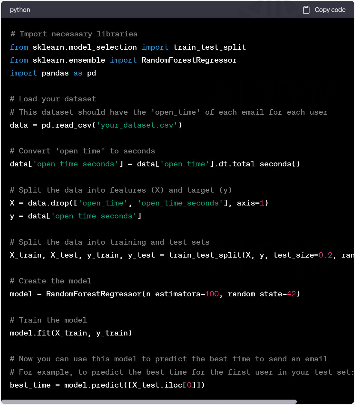 Here is an example of how AI can be used to predict the best time to send an email in Python: