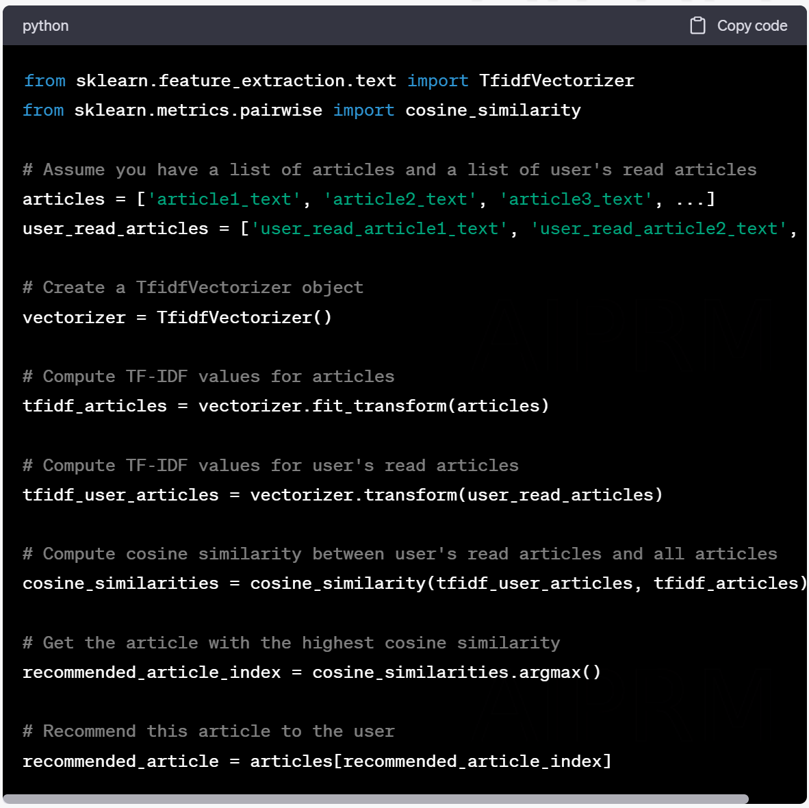This code uses the TF-IDF (Term Frequency-Inverse Document Frequency) to convert articles into numerical vectors. Then, we use cosine similarity to find the article that is most similar to the articles the user has already read. It's a simple yet effective way to personalize content for users.