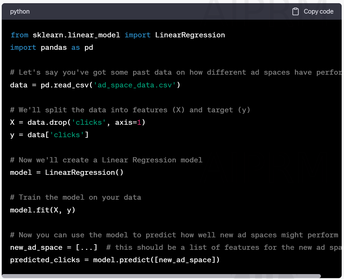 In this example, we're using a Linear Regression model to predict how many clicks different ad spaces might get. This can help in deciding how to allocate ads to different spaces. Remember, this is just a simplified example - you'd need to tailor this to your specific situation and maybe use a more complex model to get the best results.