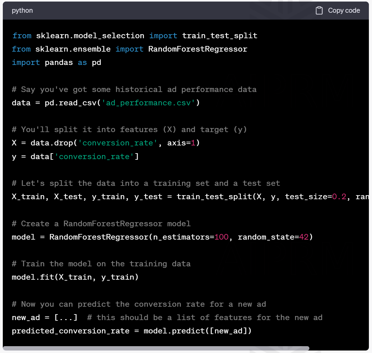 In this code, we're using a machine learning model (Random Forest Regressor) to predict the conversion rate for a new ad based on historical data. So, you could use this to figure out which ads are likely to perform best and focus your budget on those.