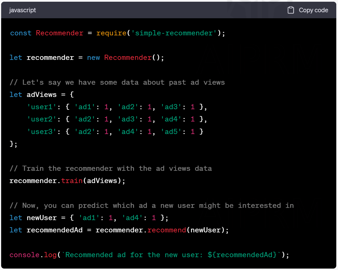 console.log(`Recommended ad for the new user: ${recommendedAd}`);