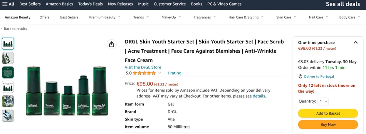 We used Amazon's international platform, which offers a robust infrastructure for e-commerce and provides access to millions of potential consumers. To optimize DrGL's product visibility and engagement on Amazon, we applied various tactics such as Amazon SEO, PPC advertising, and a tailored product description strategy focused on highlighting the uniqueness and benefits of DrGL's skincare range.
