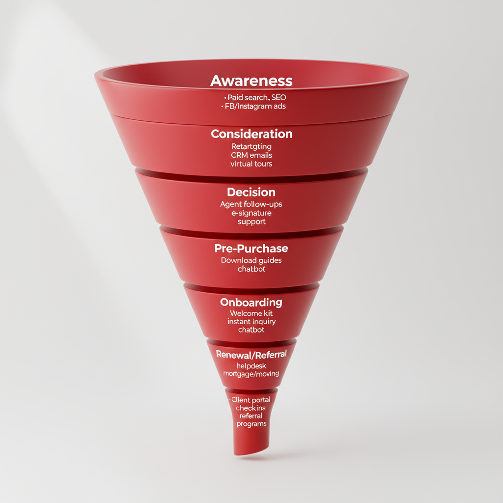 A homebuyer starts by Googling "best neighborhoods to invest in Lisbon," lands on multiple real estate aggregator sites, and peruses various agents’ listings (buyer’s journey—awareness). Clicking on a particular agency’s ad, the buyer explores that brand’s site, schedules a virtual viewing, and receives tailored buying guides and reminders (customer journey—pre-purchase). After purchasing, the agency sends moving tips, connects them with local service partners, and follows up one year later with a home value update and referral incentives (customer journey—onboarding & renewal).