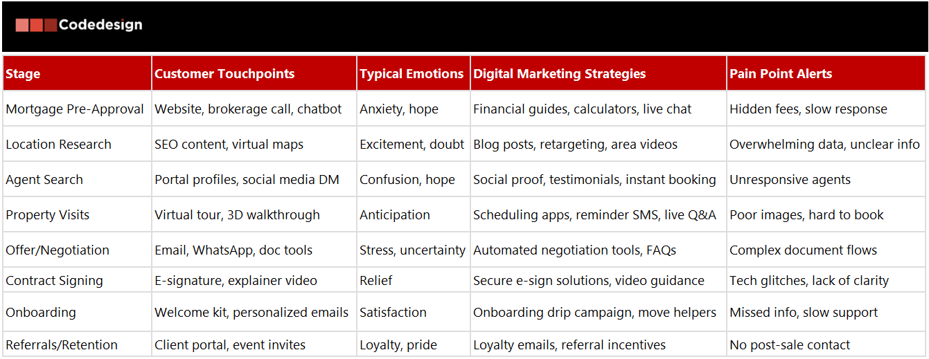 - Visualizes the complete customer experience: Journey maps provide a clear picture of buyer emotions, touchpoints, and pain areas—from initial property search to closing and post-sale support. This helps prioritize marketing and service improvements.
