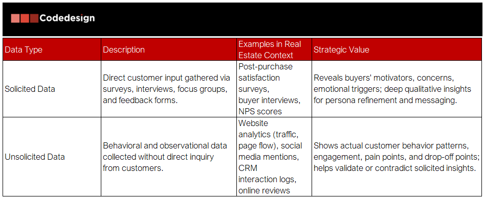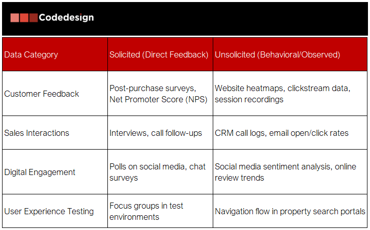 Customer journey mapping relies on a combination of solicited and unsolicited data to gain a balanced and detailed understanding of how customers behave, think, and feel throughout their experience with a real estate brand.