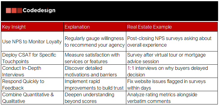 - Customer surveys and interviews: Collect feedback on buying experience, communication clarity, satisfaction with agents, and pain points during closing.