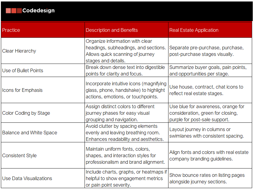 A well-designed customer journey map transforms complex buyer data into a clear, visually engaging, and actionable tool that teams can easily understand and use. Real estate decisions are emotional and complex, so maps must communicate key insights, emotions, and touchpoints simply without overwhelming users with data.