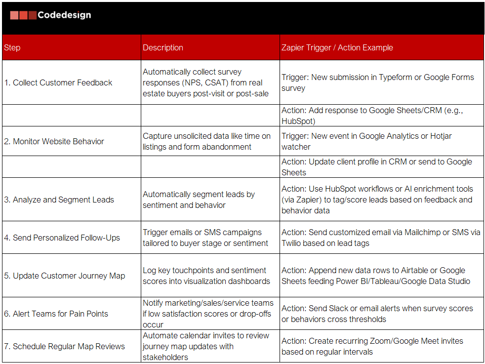 Prompt example: “Connect Google Sheets containing real estate client journey data to Airtable via Zapier. Sync new/updated rows so the customer journey map dashboard reflects the latest feedback and interaction data.”