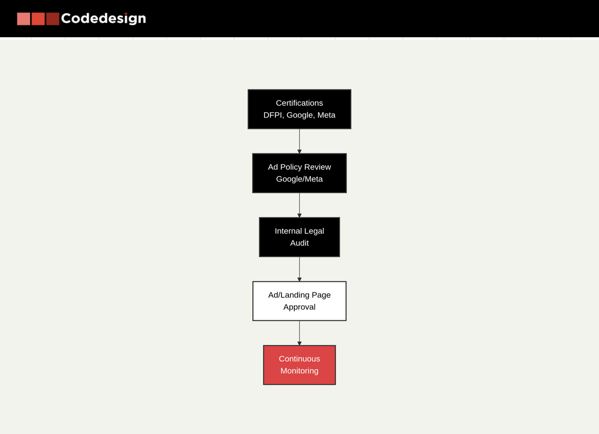 Choosing Codedesign to implement a digital strategy for debt relief companies means partnering with an agency that brings deep sector-specific expertise and a proven track record navigating the highly regulated and competitive debt relief market. Codedesign's comprehensive approach balances legal compliance, advanced targeting, and multi-channel engagement—essential for success in an industry where ad account suspensions, compliance risks, and high acquisition costs are commonplace. Their strategic focus on tightly themed campaign structures, audience segmentation, and dynamic creative optimization ensures efficient budget use and scalable lead generation while safeguarding brand reputation.