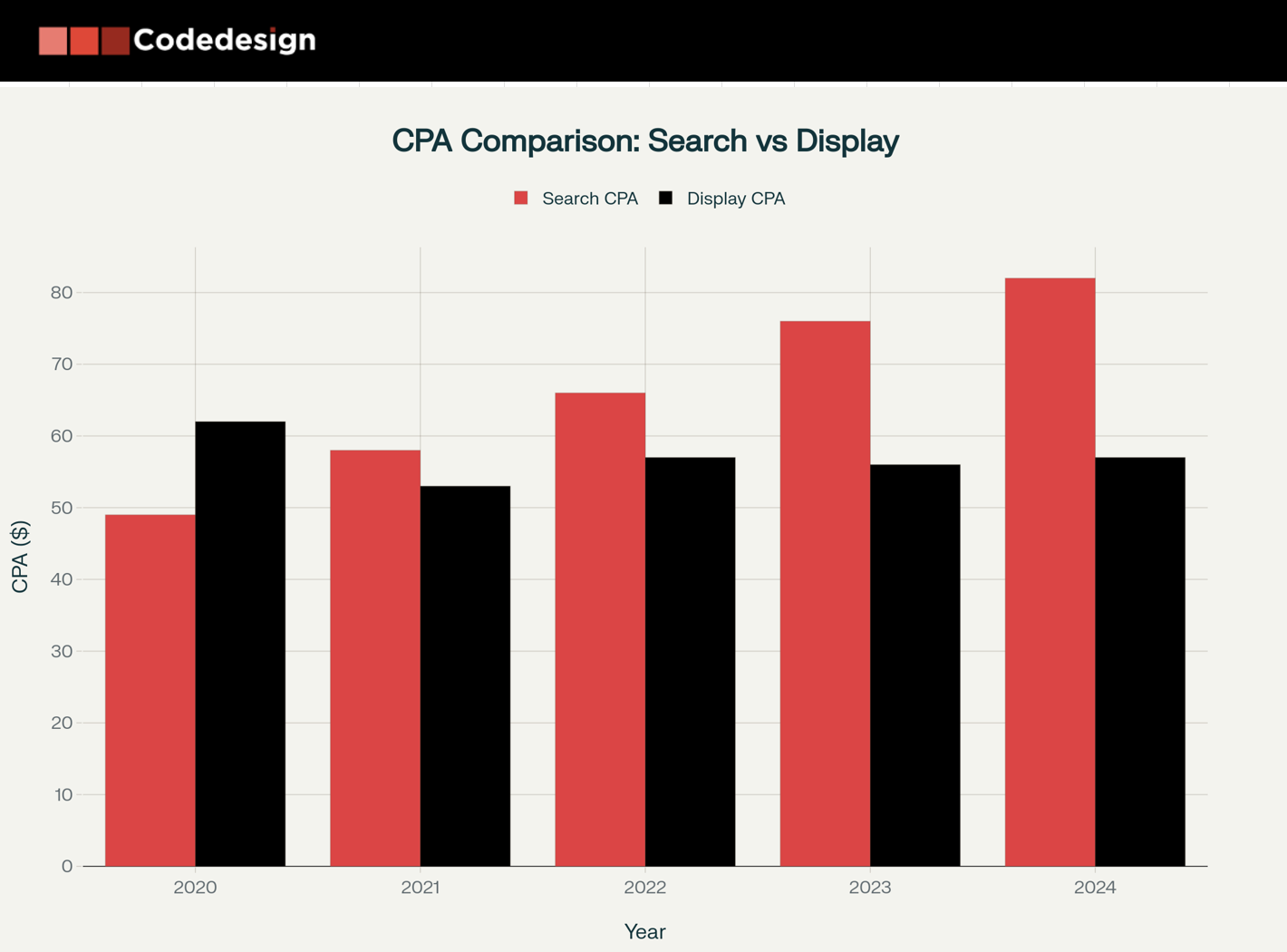 Cost Analysis Insights - The agency provides detailed CPA evolution data showing search CPA increasing 67.5% from $48.96 in 2020 to $82.00 in 2025, while display CPA has shown more volatility but stabilized around $57.00. This data informs realistic budget expectations and bidding strategies.