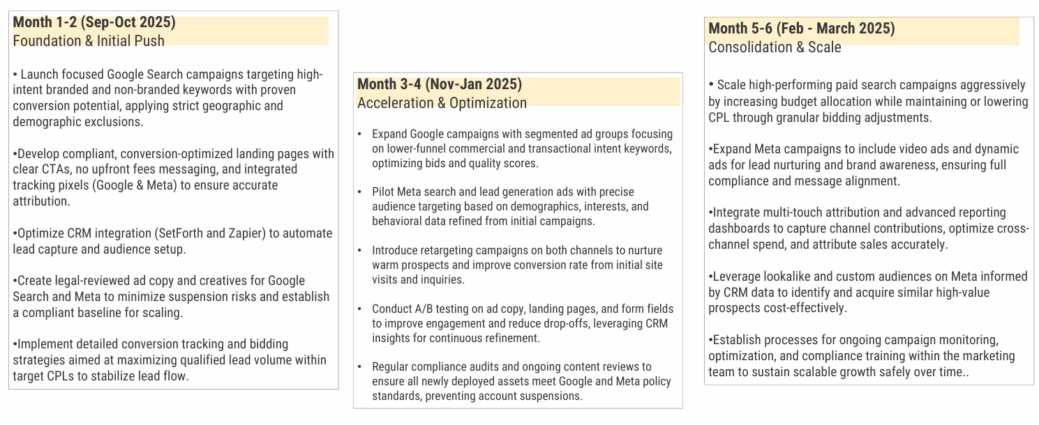 Months 1-2: Foundation and Initial Push: The launch phase focuses on Google Search campaigns targeting high-intent keywords with strict geographic exclusions, compliant landing page development, CRM integration optimization, and legal-reviewed creative assets.