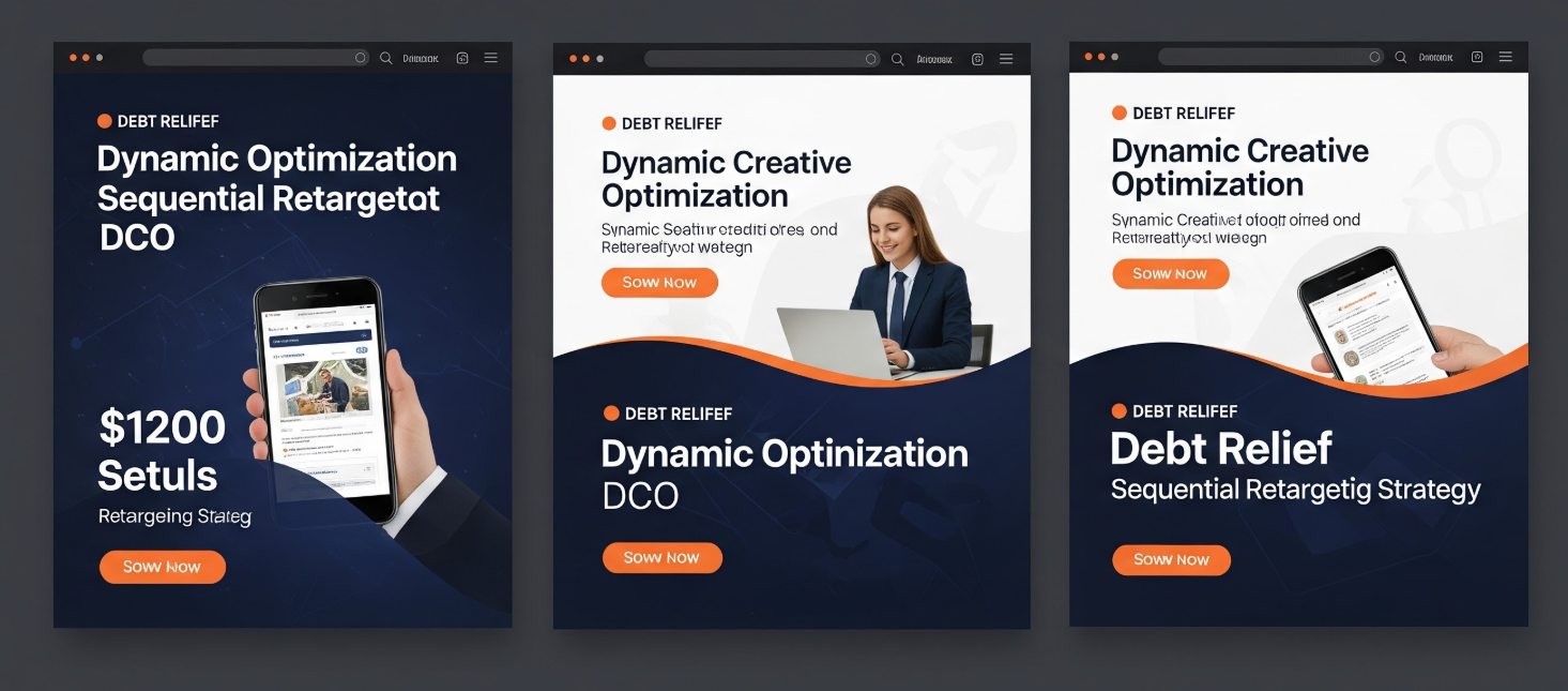 Personalized Messaging at Scale: Using contextual signals and audience data, DCO creates personalized ad experiences that speak to specific debt situations. For example, users researching credit card debt see messaging focused on unsecured debt relief, while those researching medical debt see healthcare-specific creative.