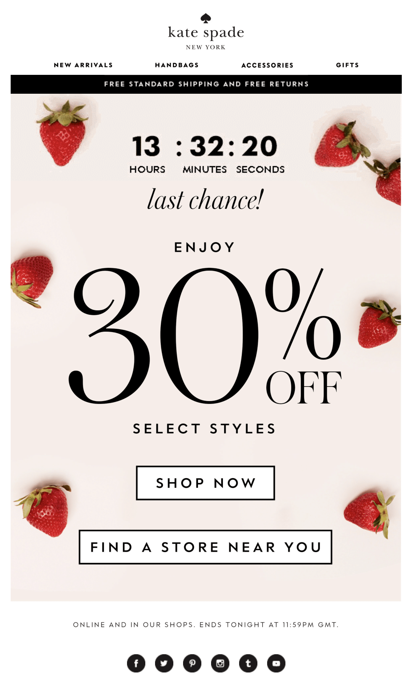 Plan a time frame for certain products during which they will be offered at a discounted price and place a countdown timer next to them, like this Kate Spade last chance offer.